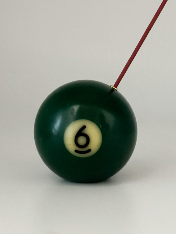 당구장에서 보낸 치열한 움직임으로 인해 자연스럽게 만들어진 흔적 (스크래치, 미세 점등)이 담긴 포켓볼로 제작한 인센스 홀더 혹은 문진 오브제입니다.