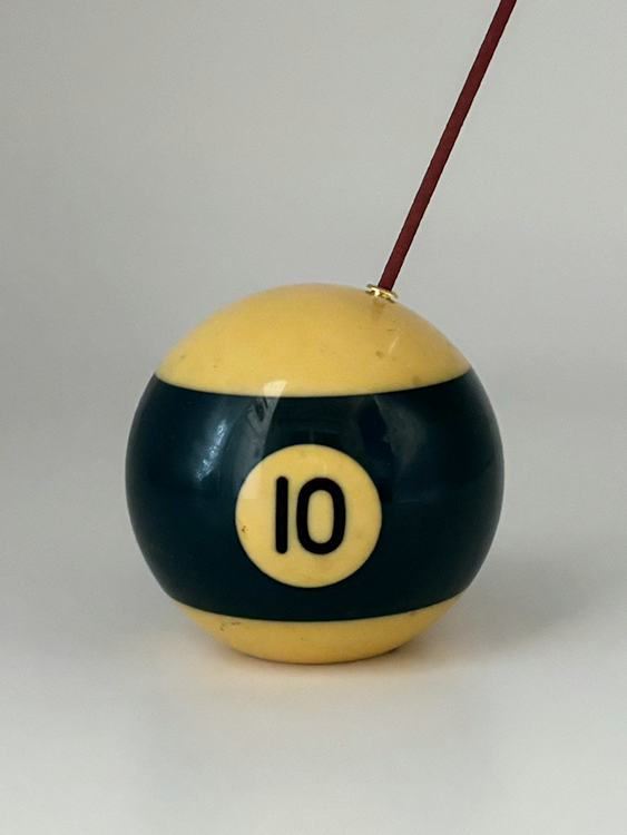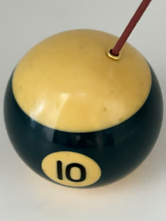 당구장에서 보낸 치열한 움직임으로 인해 자연스럽게 만들어진 흔적 (스크래치, 미세 점등)이 담긴 포켓볼로 제작한 인센스 홀더 혹은 문진 오브제입니다.